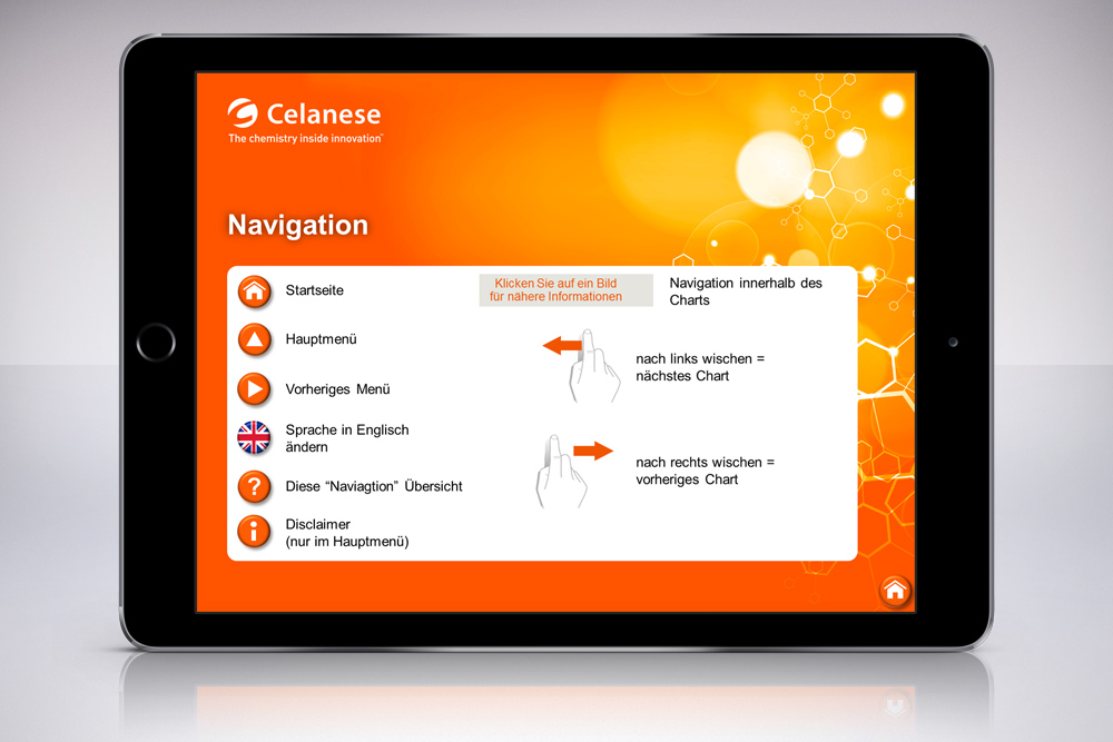 Die Navigation wurde über interaktive Bild- und Textelemente auf zwischengeschalteten Charts gewährleistet. Auf den Charts selbst wurde die Navigation auf maximal drei Elemente im unteren rechten Bereich reduziert. Von jeder Seite konnte so innerhalb kürzester Zeit auf die entsprechenden Ebenen zurück navigiert werden.